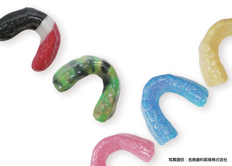 患者様の要望に適したカスタムマウスガードを提供しています。プロの方もアマチュアの方も、市販品と当院オリジナルの専用マウスガードから選べます。歯型に基づいて製作される専用マウスガードは「しゃべりにくさ」が最小限で、フィット感が良く、高いパフォーマンスが期待できます。豊富なカラーオプションもあり、チームの一体感を演出可能。